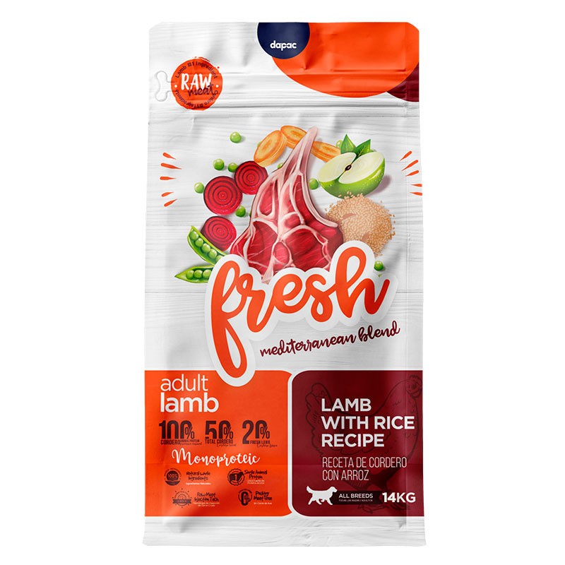 Adult Lamb es la variedad de cordero de Fresh Mediterranean Blend. Este alimento completo está indicado para perros adultos de cualquier raza. Sus principales ingredientes son cordero deshidratado, cordero fresco 20% y arroz.