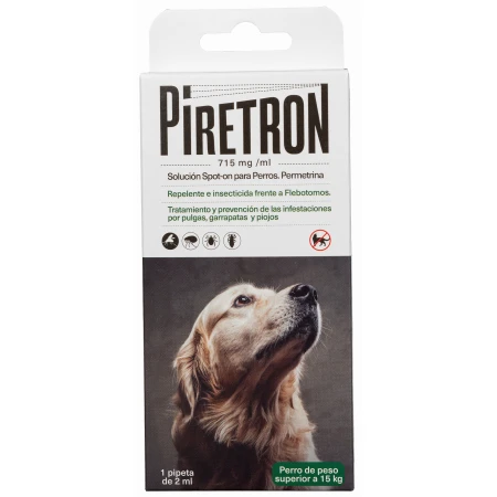 Antiparasitario externo para la prevención y el control de mosquitos, flebotomos, pulgas, garrapatas y piojos. Las Pipetas piretrón Spot On para Perros tienen permetrina como principio activo, con una concentración elevada de 715 mg/ml. Su fórmula de bajo volumen/alta concentración se difunde rápidamente y consigue un efecto insecticida rápido.